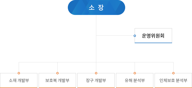 보호복 및 보호장구의 개발을 연구하고 분석하는 부서 조직도 입니다.
